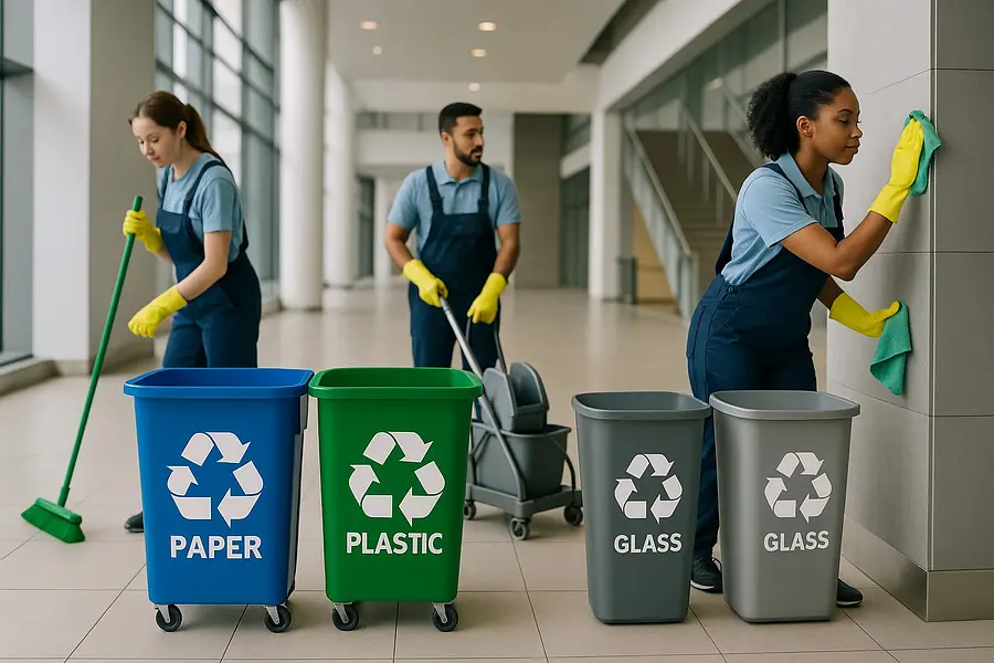 Daily/weekly office cleaning: trash & recycling, restrooms, supply restock, kitchenettes, desks, floors, and touch-point disinfection.